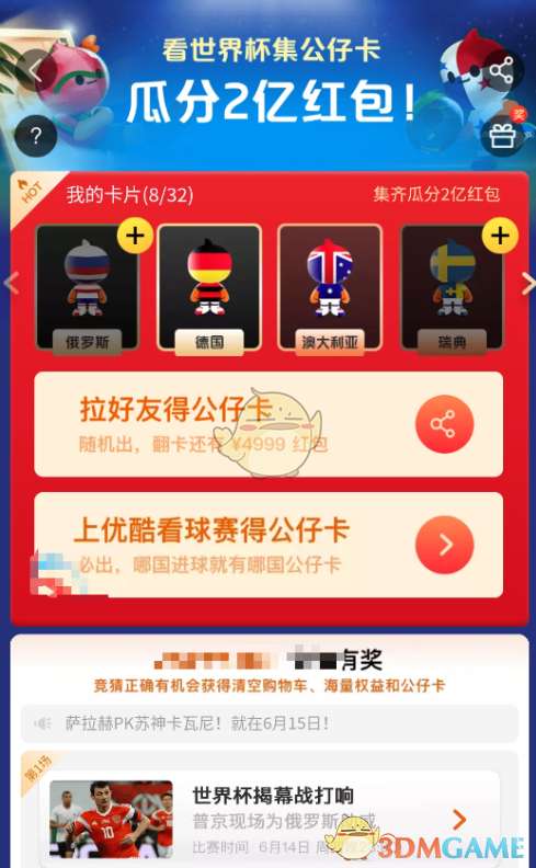 5、只要你集齐了32个公仔卡即可瓜分2亿红包,开奖时间为7月16日。 玩法介绍 公仔卡收集方法 赠送公仔卡 索要公仔卡