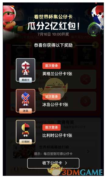 4、你重新进入这个活动页面,就会获得一个国家的公仔卡,通过这种技巧,每天最多可得到3张公仔卡。