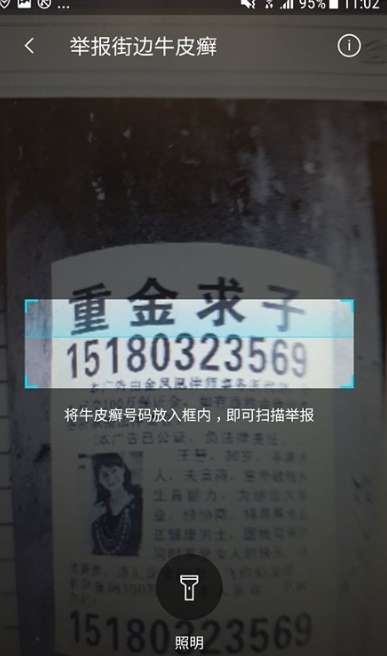 1、想要来举报街边的牛皮癣,你需要先使用腾讯手机管家来扫一扫自己所看到的牛皮癣广告,对准小广告的电话号码。