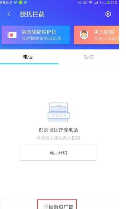 3、进入骚扰拦截的页面后,选择下方“举报街边广告”按钮,就可以成功的举报该广告了。而且软件还会上报位置信息,以提醒其他用户小心别上当。