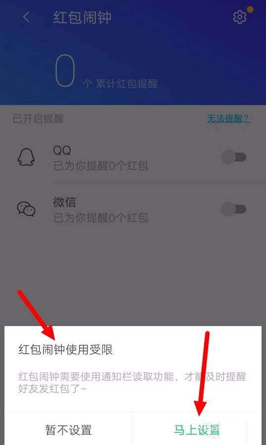 3、系统会提示你红包闹钟功能受限,选择马上去设置。