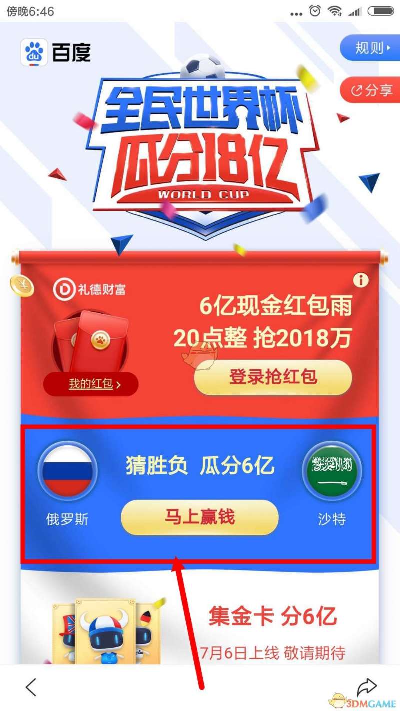 3、进入“全民世界杯杯 瓜分18亿”页面后,我们会看到“猜胜负瓜分6亿”的字样,点击进入即可!(如下图)