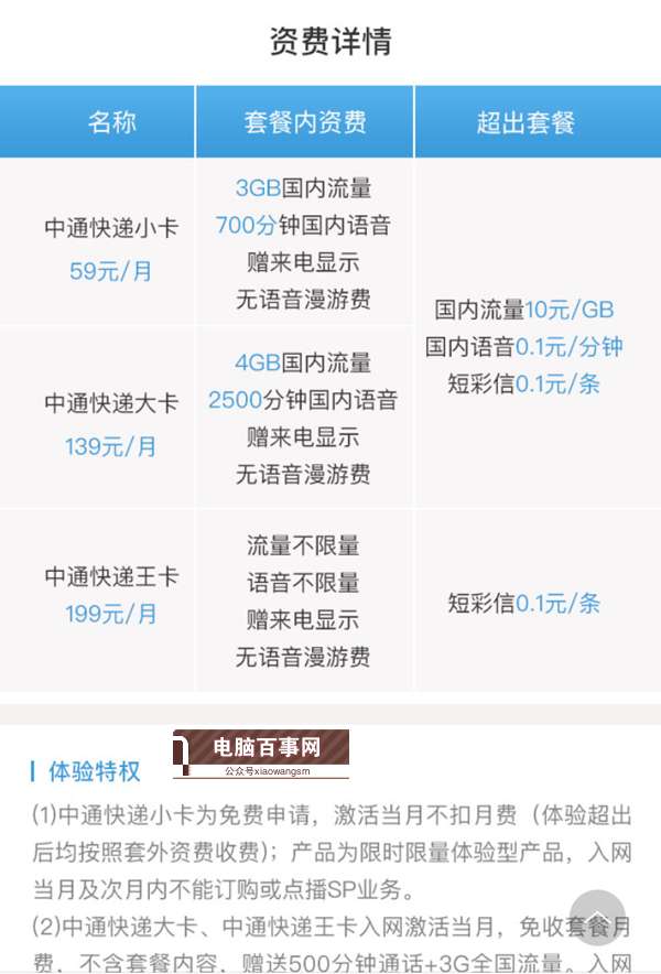 | 59元中通快递小卡 | 3GB全国流量 700分钟国内语音 赠送来电显示 无语音漫游费 | 国内流量10元/GB 国内语音0.1元/分钟 短彩信0.1元/条 |