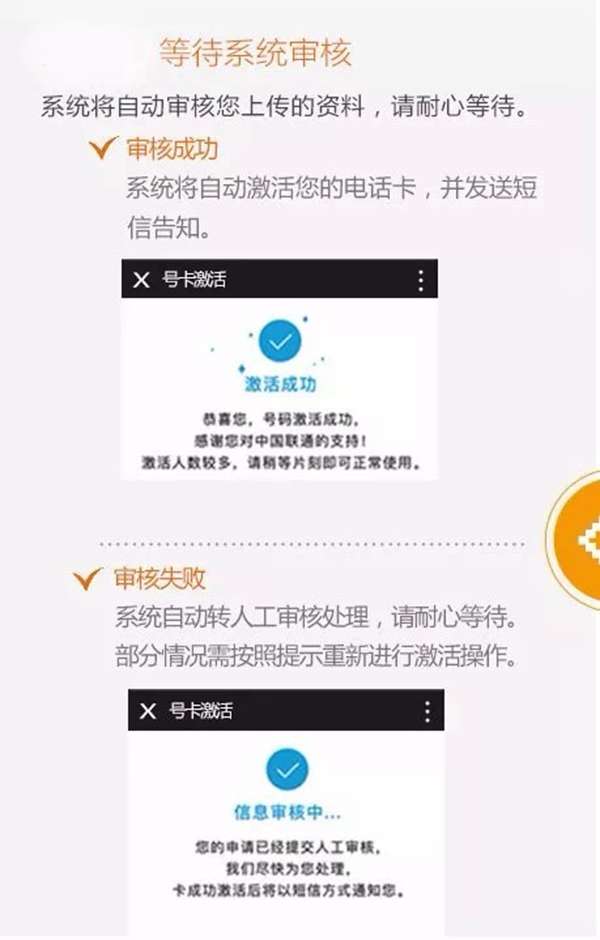 审核通过后将自动激活您的电话卡,并发送短信至您下单时预留的联系电话。审核失败不通过,可以按照提示选择“重新上传资料”或人工审核。