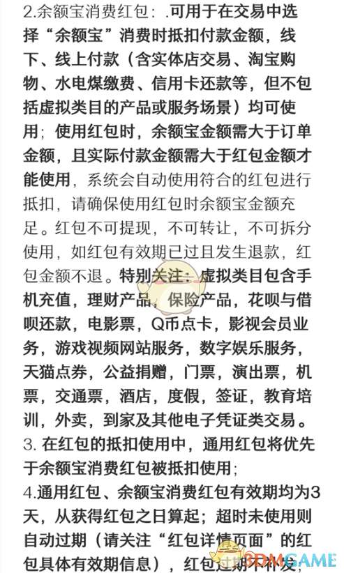 从2018年6月19日起,用户参与天天领红包活动的同时,还有机会随机获得余额宝消费红包。 需要注意的是,用户不能100%获得余额宝消费红包,而且用户单次获得的余额宝消费红包的金额及个数均为系统随机派发。 余额宝消费红包仅限余额宝付款时使用,包括线下、线上付款,比如实体店、淘宝购物、水电煤缴费、信用卡还款等等。 余额宝消费红包使用规则: