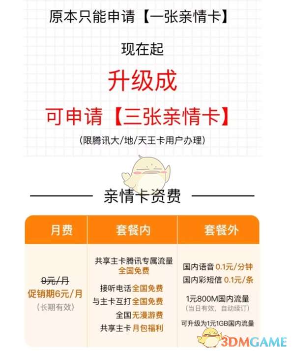 腾讯亲情卡升级套餐详情 今年1月底,腾讯王卡推出亲情卡,每月只需缴纳月租费,就可以和另一个手机号共用一个话费账户,相当于一个主卡、一个副卡。 今天王卡助手宣布亲情卡升级!现在起可申请三张亲情卡(限腾讯大、地、天王卡办理)。