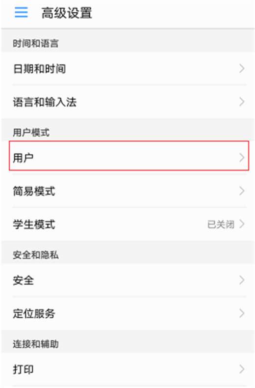 进入高级设置界面后,能看到用户模式下有一个【用户】选项,点击进入用户。