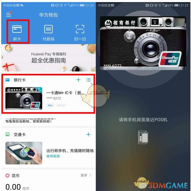 秒变银行卡 开启这个功能的前提是,要把银行卡绑定在【华为钱包】里哦~ 开启【NFC】后,打开【华为钱包】-【刷卡】,验证完支付指纹之后就可以把手机背面靠近POS机刷卡啦。