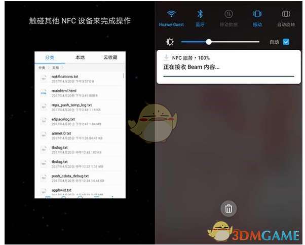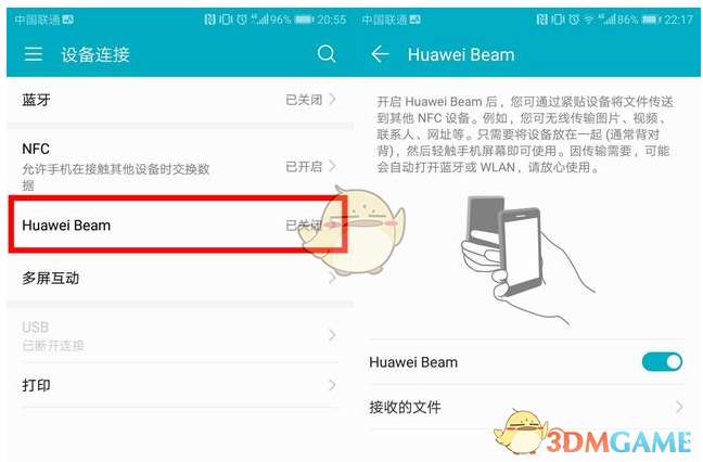 (注:【Huawei Beam】在【设置】-【设备连接】里开启,通过NFC传输的文件会保留在此)