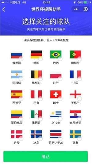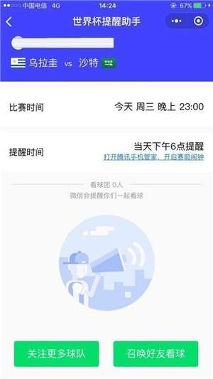 由于时差的原因,本届世界杯大多数比赛都将在北京时间20点以后甚至凌晨进行。为了让广大球迷及不错过精彩比赛,腾讯手机管家上线了世界杯提醒助手小程序。用户点击开启赛事提醒,比赛开始前即会收到贴心通知,避免错失看球最佳时机。 打开世界杯提醒助手小程序,选择自己支持的一只或者多只球队,球队的比赛信息就会出现。用小程序关注球队之后,关注的球队有比赛,小程序会在当天下午6点的时候发送提醒,你关心的比赛,一场也不错过。