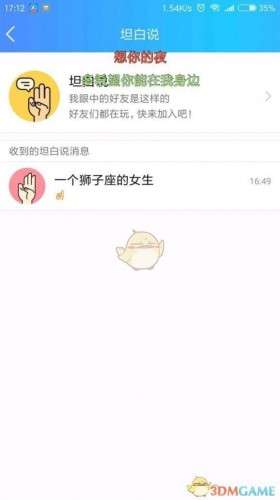而且一轮过后我们需要等待二十分钟才能迎来下一次的坦白说,当然了,如果直接邀请好友的话,也是可以直接跳过等待时间进入下一轮坦白说的。5、不仅如此,我们还可以向好友分享我们的坦白说,这样也可以向好友展示你在好友心目中的形象,也可以让你的好友更加的了解你,可谓是一举两得。怎么知道是谁说的收到信息后,不知道是谁⊙ω⊙,我教你看看谁这么调皮