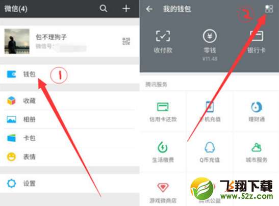 然后打开微信切换到我的页面,右下角【我】--【钱包】--点击【右上角图标】。