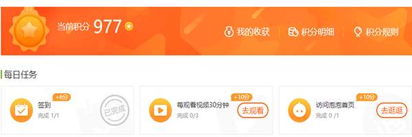 A:通过做任务可以赚取积分。每日24点刷新,任务含:签到,观看视频30分钟,访问爱奇艺泡泡首页。