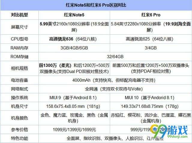 从价格对比来看,除了都有3+32GB版,差价100元外,其它版本Note5内存规格相比6 Pro高一些,因此差价显得要大一些。总的来说,红米6 Pro实际相比Note5就便宜100元的样子。