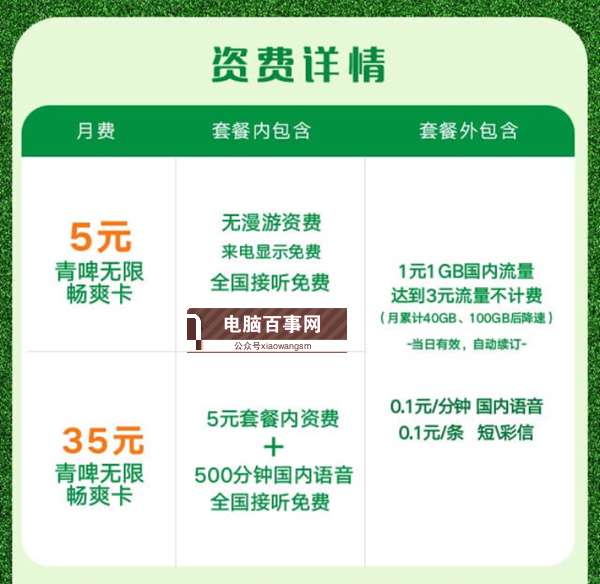 其中5元青啤无限畅爽卡,套餐包括无漫游资费,来电显示免费,全国接听免费;35元青啤无限畅爽卡套餐内包含全国接听免费,无漫游资费和来电显示免费+500分钟国内语音。