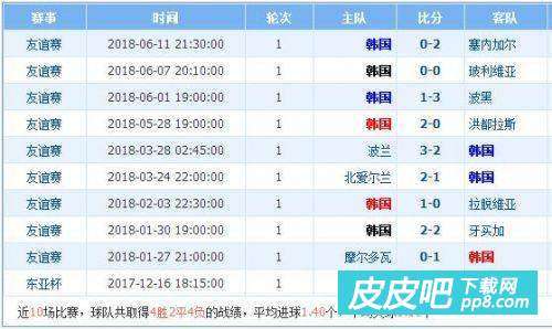 最新韩国队近10场比赛,球队共取得4胜2平2负的战绩,平均进球1.40个,平均失球1.30个。