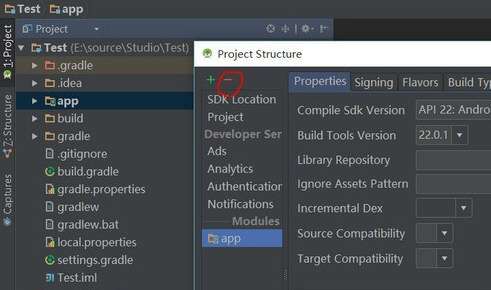 在“Project”视图中选择需要删除的module名,此处删除“app”,点击右键,选择“Open Module Setting”,出现如下界面,然后选择左上角的“-”号,将此module从“Test”项目列表中移除(并没有真正的从硬盘删除)
