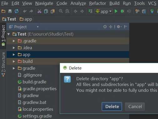 再次在“app”上点击右键,出现“delete”选项,点击“delete”,将其从“Test”项目列表中彻底移除(此时真正的从硬盘移除)