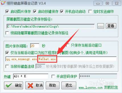 楼月键盘屏幕全记录 V3.4 官方版类别:键盘鼠标 大小:356K 语言:简体中文评分:6下载地址软件安装后是隐藏运行的,于是需要用热键(默认热键:Alt+K)将其调出。调出界面后再到运行的界面在仅当当前活动窗口为以下程序时才截图的列表框中将微信的进程名设置进来。