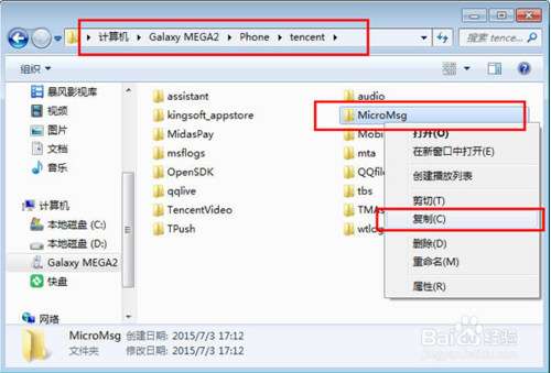 将手机与电脑进行连接,然后打开手机盘符下的Tencent文件夹,我们可以看到一个MicroMsg文件夹,该文件夹里面保存了微信聊天记录中收发的图片,语音及小视频,我们将该MicroMsg文件夹复制到电脑上的某个文件夹中,并将复制到电脑上的MicroMsg文件夹重命名为“资源目录MicroMsg”。