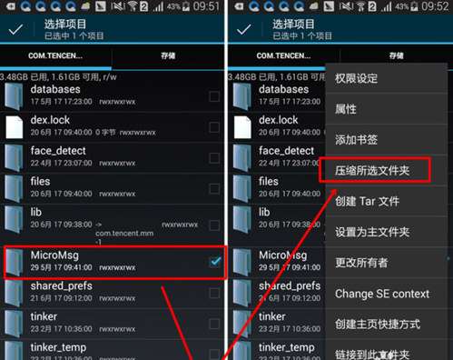 手机ROOT成功后,再到手机中安装一款RE文件管理器,需要通过此管理器将手机中的微信数据库文件夹导出到电脑上来。首先打开安装好的RE文件管理器,然后依次点击进入datadatacom.tencent.mm,勾选中“MicroMsg”文件夹(如果没有复选框的话,可以通过长按该文件夹的方式将其选中),点击右下角三个点的小图标后,再点击“压缩所选文件夹”菜单。