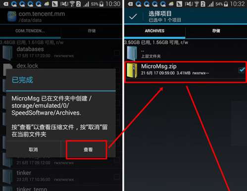 压缩结束后,请点击“查看”按钮,然后勾选中MicroMsg.zip,并点击右下角的三点小图标,如下图所示: