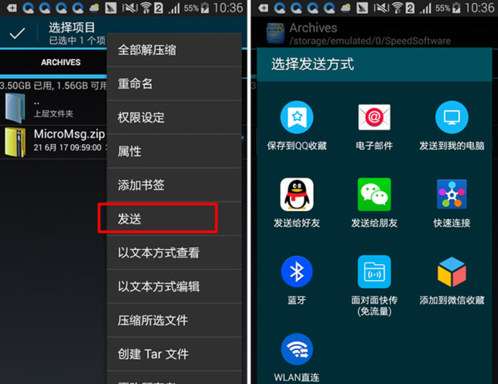 然后在弹出菜单中点击“发送”,并通过QQ或其它方式将该压缩文件发送到电脑上,并将其解压后重命名为“数据目录MicroMsg”如下图所示。
