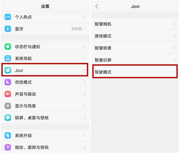 首先进入系统【设置】,在设置界面找到【jovi】选项,点击进入【驾驶模式】。