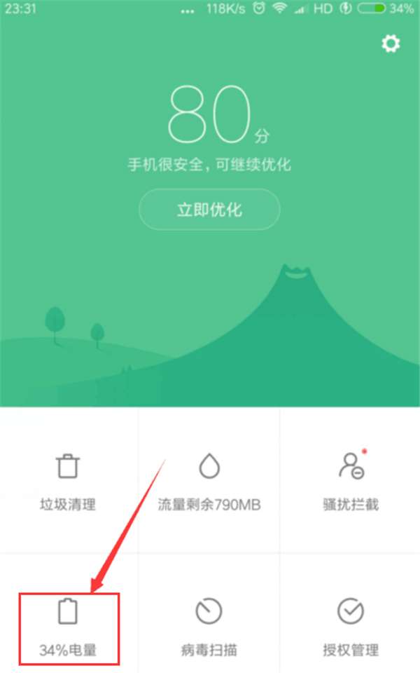第二步:在安全中心界面,点击下方的【电量】选项