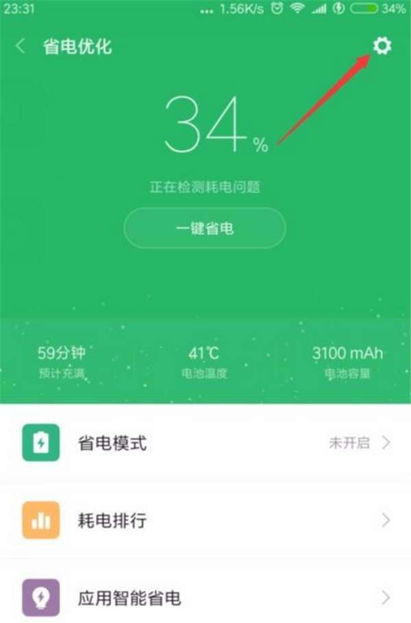 第三步:点开电量后会看到省电优化的页面 , 在这页面的右上角有个设置的按钮 , 点击打开它