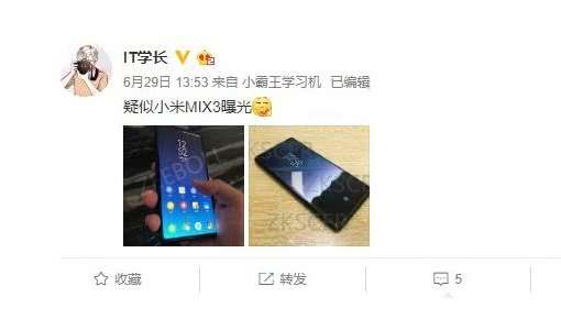 北京时间6月30号,通过数码博主@IT学长在微博发布了疑似小米MIX 3手机曝光,从图片可以看出这是一款真正的全面屏手机外观整体上面很像vivo NEX手机,细节更是有异曲同工之处的。