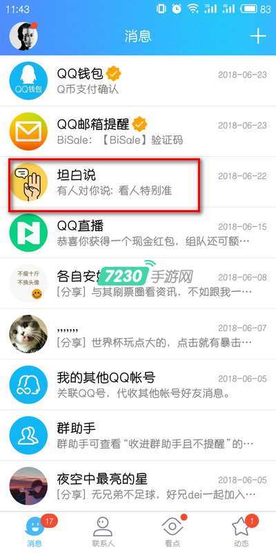 1、打开手机QQ,找到坦白说