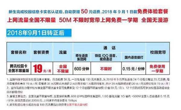 对于9月1日开学党来说,是个不错消息,资费低,还可以免费使用校园宽带一学期,国内语音0.15元/分钟,部分腾讯应用还免流,不过20GB封顶,限速1Mbps。