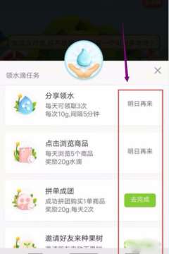 点击后会出现一个下拉菜单如下图,可以看到里面有:分享领水、点击浏览商品、拼单成团、邀请好友来种果树,前三个按照提示完成可以获利相应数量的水滴,获利后及时去浇树;第四个按钮点击并分享链接,每一位好友从链接进来会奖励20克水滴,目前不限数量。