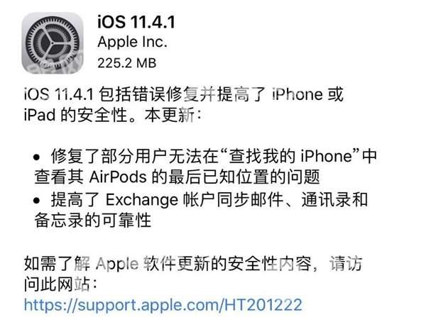 iOS 11.4.1更新的公告中,苹果强调,修复了部分用户无法在“查找我的 iPhone”中查看其AirPods的最后已知位置的问题,并提高了Exchange账户同步邮件、通讯录和备忘录的可靠性。