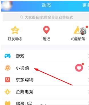 1、想要利用QQ小视频查看坦白说里别人的昵称,需要先去动态页面点击“小视频”功能,然后上传一个手机里的小视频。