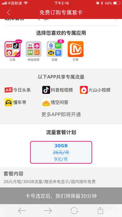 头条爽卡包含30GB的定向流量,对应App为今日头条、抖音短视频、火山小视频、懂车帝、悟空问答等。套外资费为1元/800MB/天,通话0.19元/分钟。