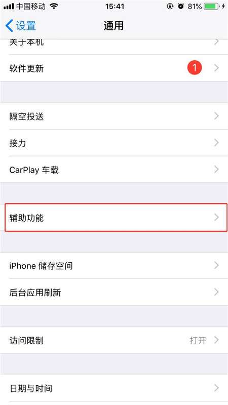 3、在通用页面中,打开“辅助功能”。