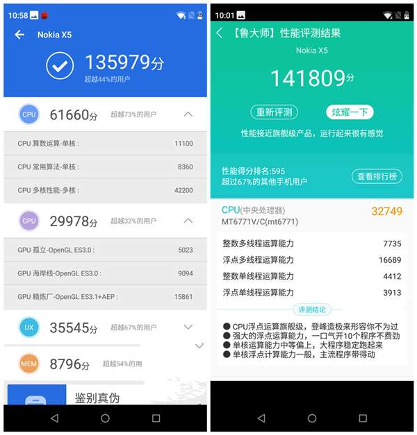 从跑分测试来看,诺基亚x5的安安兔跑分高达135979分,鲁大师的跑分为141809分。我们可以看出诺基亚x5搭载的联发科p60处理器表现追评骁龙660处理器。