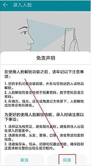5、在弹出的“免责声明”;中单击【同意】就可以开始录入人脸,录入完成即可设置人脸解锁。