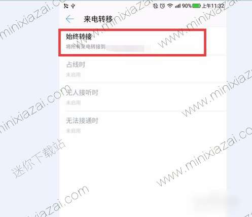 5在“来电转移”中,我们可以根据情况来设置转移类型,第一个就是“始终转接”