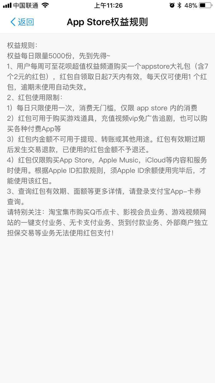需要注意的是,在使用蚂蚁花呗AppStore红包前,AppStore中的余额要处于清空状态,否则会优先抵扣余额而不是支付宝。另外,这款AppStore周卡是限量供应,每天只有5000份,以小雷个人的经验来说,晚上刚过0点时是比较好抢的。如果你近期在AppStore中有购买应用的需求的话,可以去先去支付宝中买张AppStore周卡。