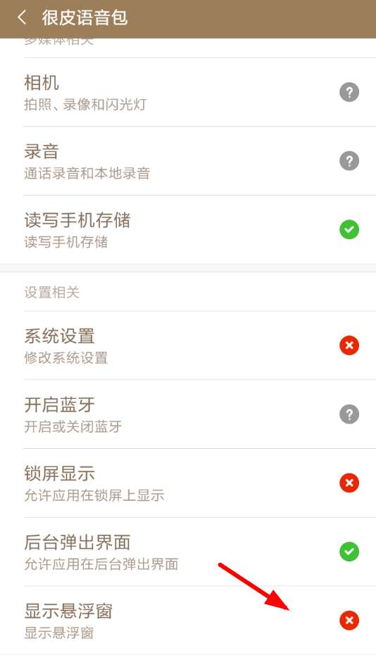 其实在用户进入很皮语音包的时候,就会有系统提示用户开启悬浮窗,不然就无法在其他软件里使用很皮语音包了。我们根据系统引导点击进入权限设置页面。