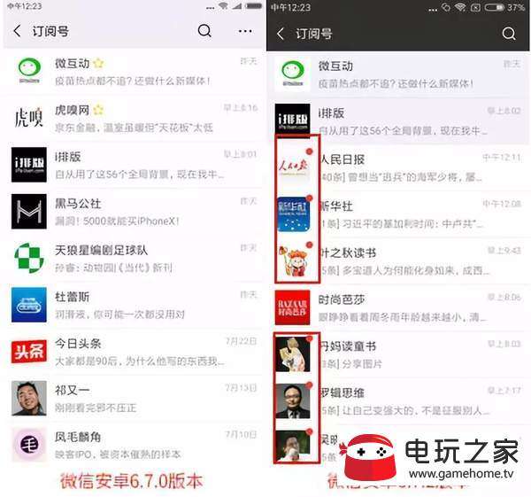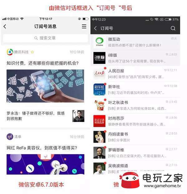 由微信对话框进入之后,直接呈现的是微信订阅号列表框,而,微信的6.7.0改版时,首先呈现的是按时间排序的信息流。