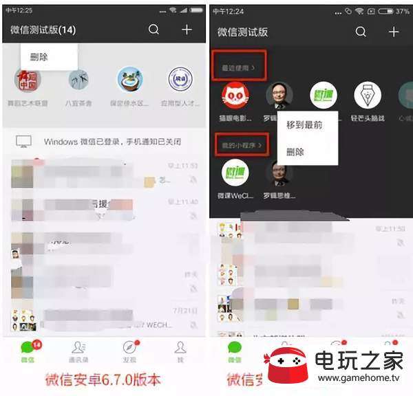 此次更新,特别突出了小程序的更新。新增了“我的小程序”项,简单来说,就是可以将我们需要用到的小程序添加到“我的小程序”里面,方便快速打开使用。