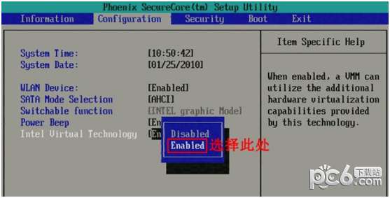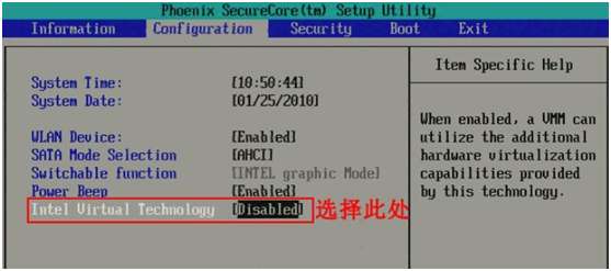 (1) 选择Configuration选项,选择Intel Virtual Technology并回车。