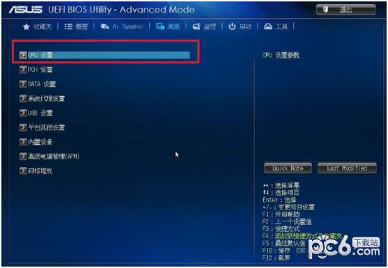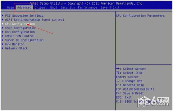 (1) 进入BIOS,键盘的左右键选择“advanced”;界面,然后用上下键选中“CPU configuration”;,Enter回车。