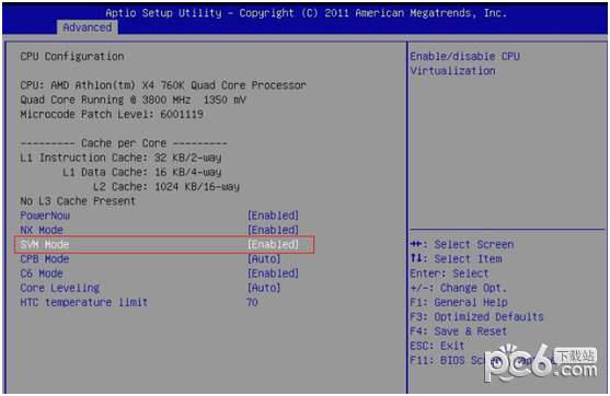 (2) 用上下键选中“SVM Mode”;(全称“secure virtual machine mode”;),Enter回车,将“Disable”;改成“Enable”;即可,F10保存退出并重启电脑。