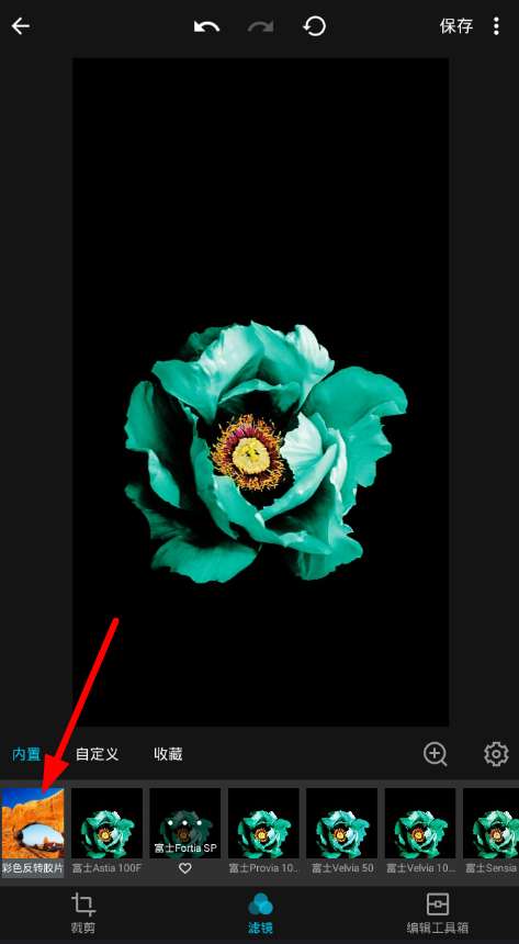 2、接下来从下方的列表里选择“滤镜”;功能,找到其中的“彩色反转胶片”;滤镜,从中即可设置反差色的效果。