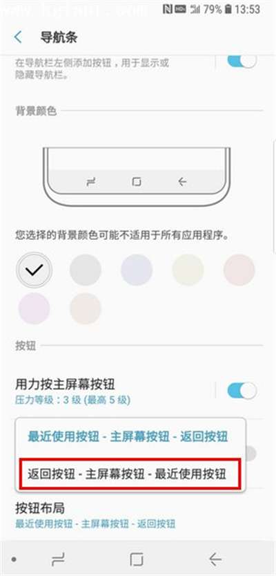 5.选择喜欢的按钮顺序,如选择【返回按钮-主屏幕按钮-最近使用按钮】。 (注:默认顺序为【最近使用按钮-主屏幕按钮-返回按钮】。)